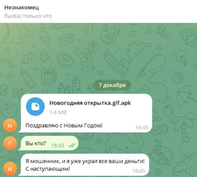 ✅Специалисты рекомендуют не открывать замаскированные под картинки, GIF-анимации или видео файлы с расширением .apk, полученные от незнакомцев, иначе можно потерять все деньги на счетах и личные данные.