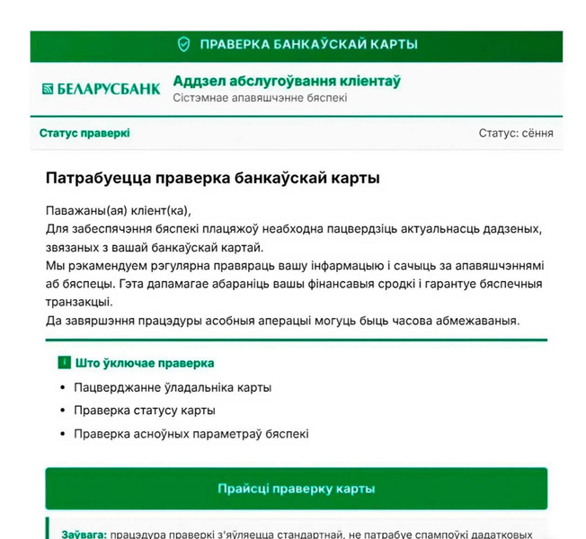 Рассылаются письма и уведомления, оформленные под «Беларусбанк», с предложением пройти «проверку карты».