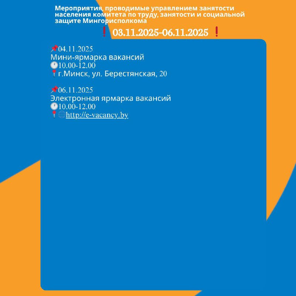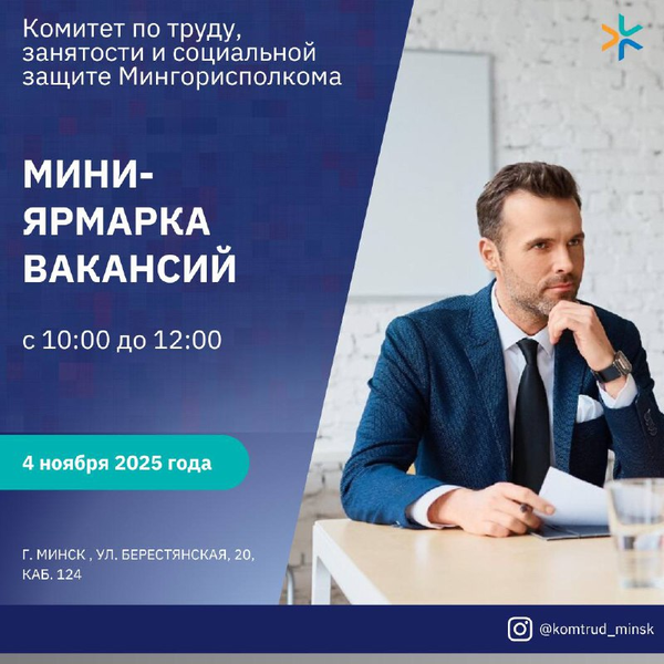 4 ноября 2025 года с 10:00 до 12:00 комитет по труду, занятости и социальной защите Мингорисполкома проводит мини-ярмарку вакансий.